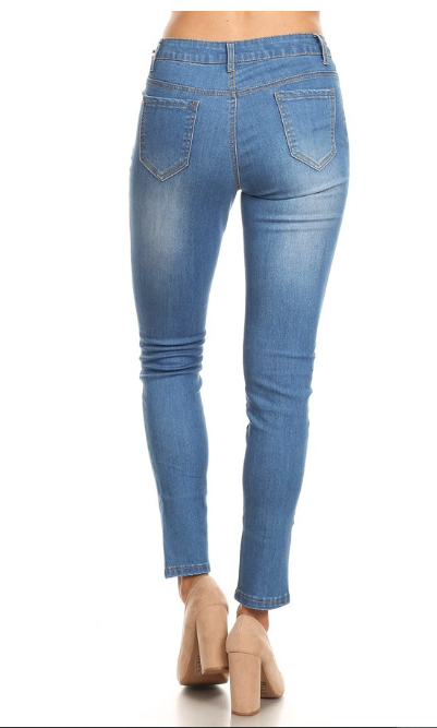 Denim, high waisted skinny jeans in a fit style, with a button/zipper and slight rips.